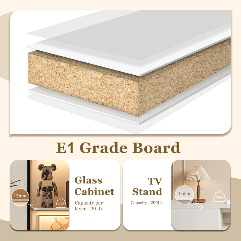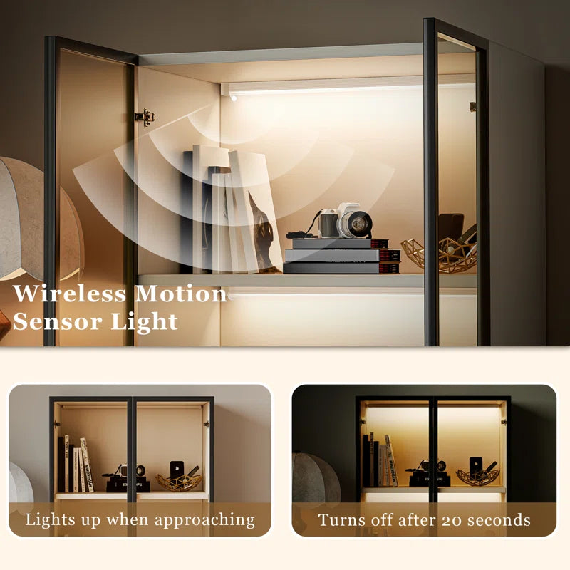- Game consoles, routers, and other gadgets can be positioned behind the tv panel, and their cords hidden to maintain the area neat. Warm, non-glaring light is provided by three rechargeable wireless motion sensor light strips that are included with the glass display cabinet. The glass and models will give your living space a more festive feel when they are illuminated at night.