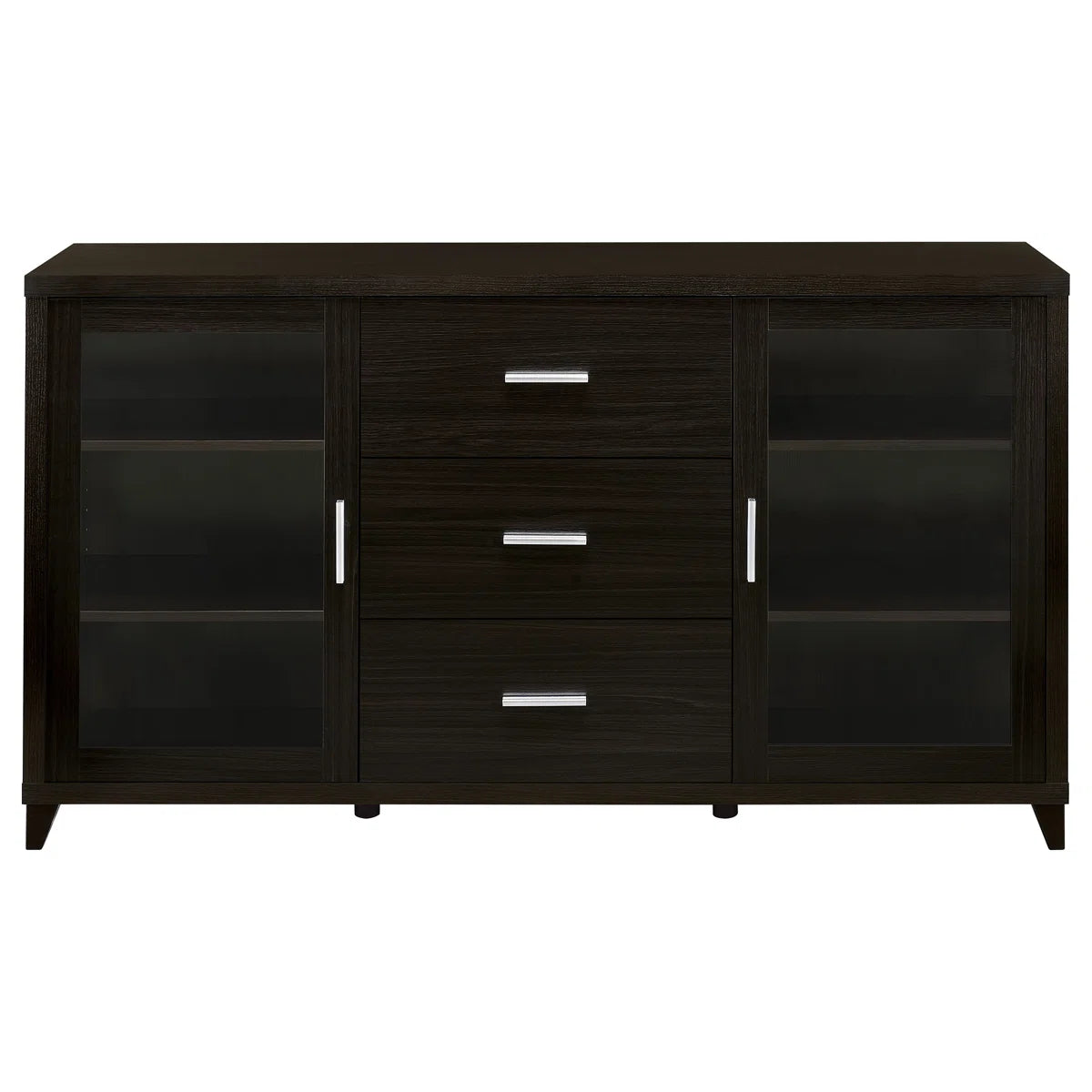 - The TV console has three (3) storage drawers, four (4) height-adjustable shelves, and two framed doors made of transparent tempered glass.