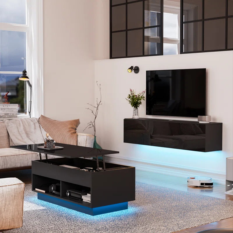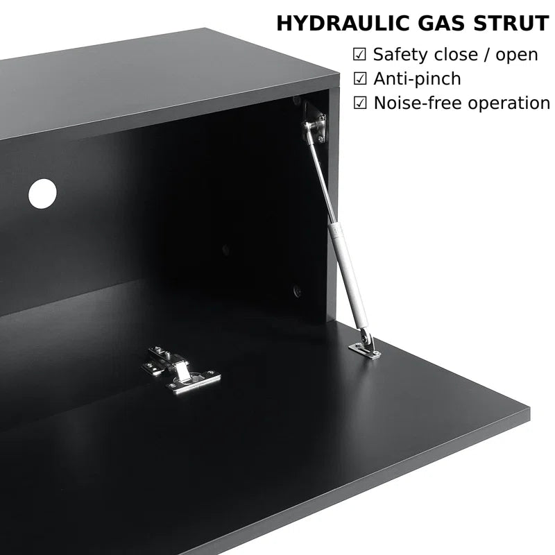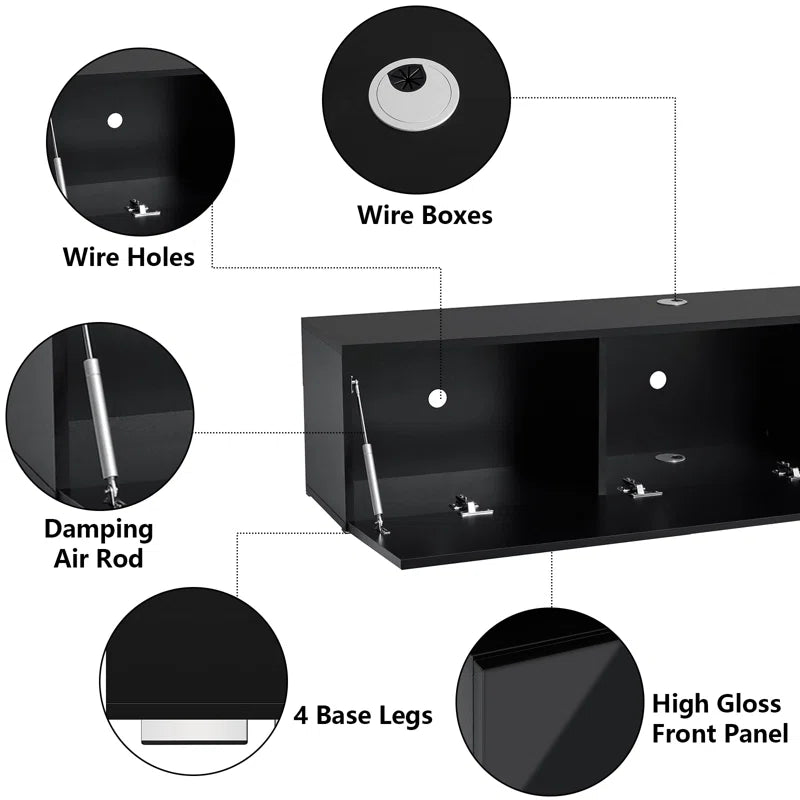 This floating TV stand features a sleek, streamlined design and built-in lighting for an ultra-modern appearance. The frame, which has a rectangular shape, is made from engineered wood. The design showcases a wide and short profile with a front that appears solid; however, it is actually a cabinet door that folds down to provide storage for books, gaming consoles, and other items. This media console can be placed on the floor or mounted to the wall for a floating effect, and we love that it features built-in lighting panels on the bottom for a fun and contemporary feel. Cutouts for cable management at the rear of the device serve to arrange your cords.