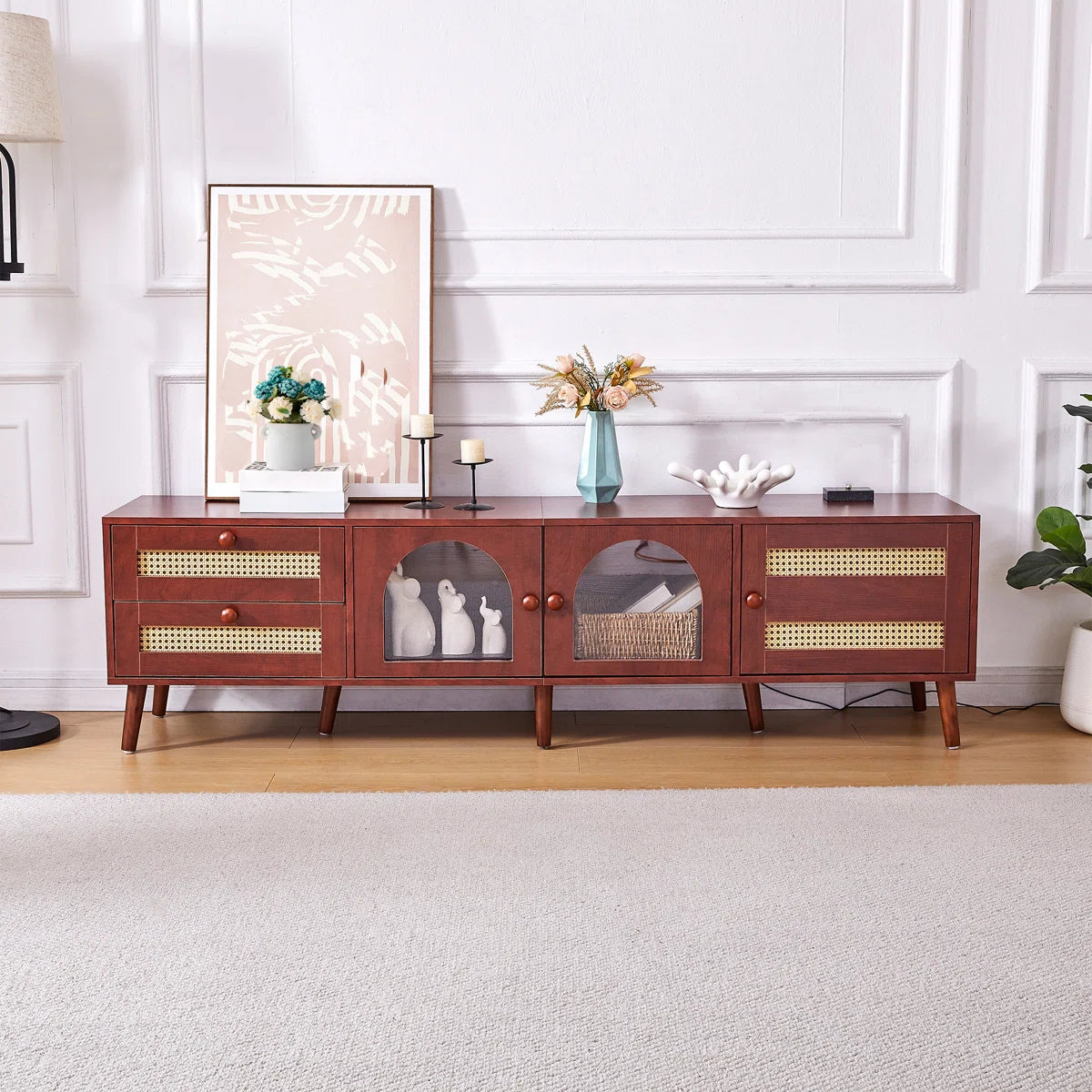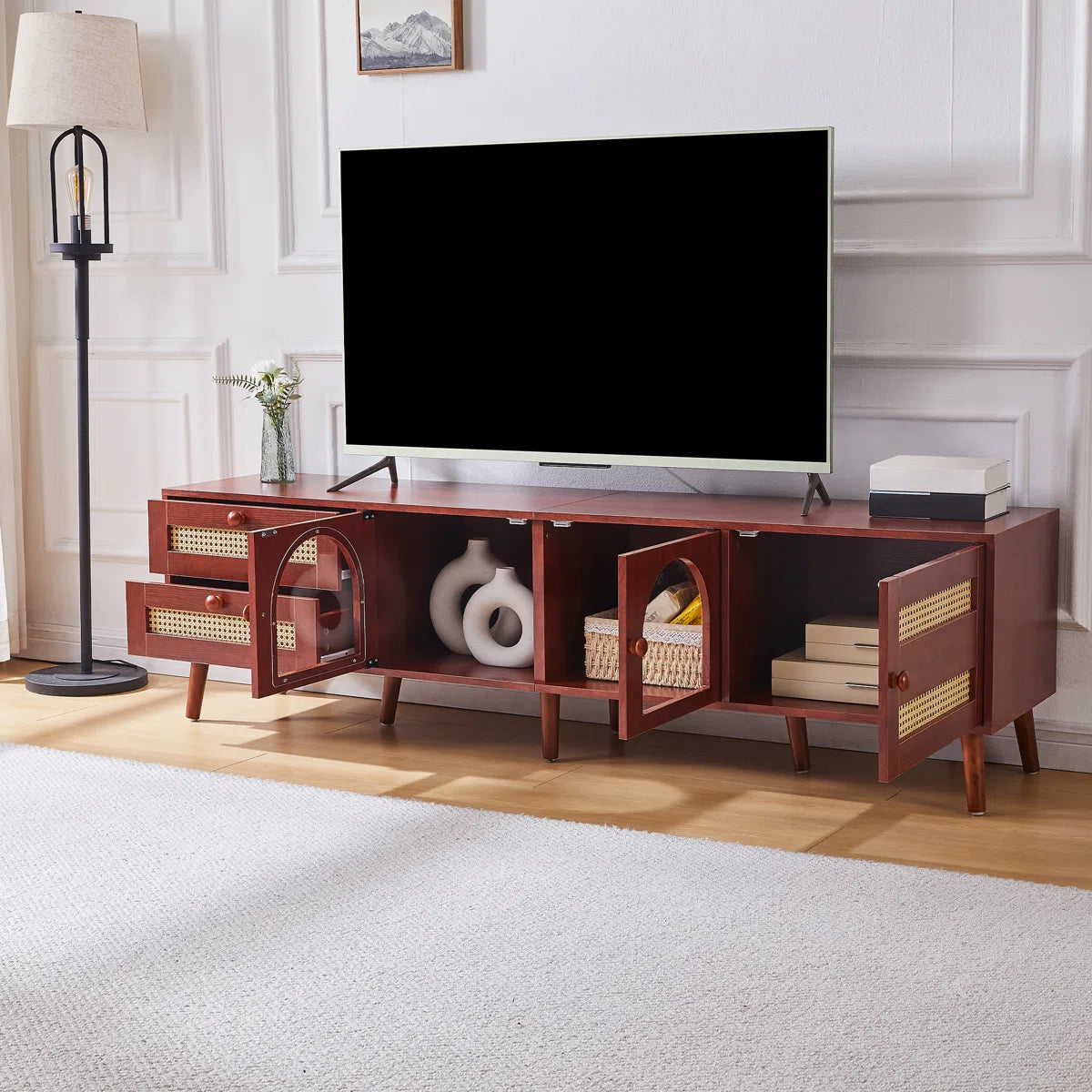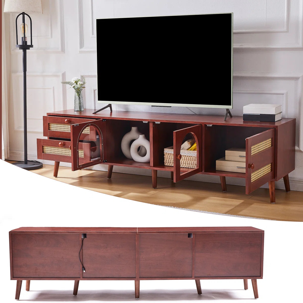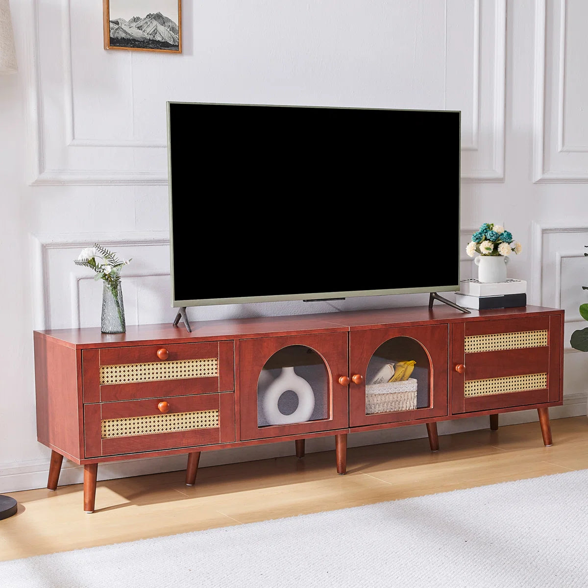 Makeover your living area with this exquisitely crafted tv panel that blends fashion and utility. This multipurpose media console, which is made with premium MDF boards and strong, solid wood legs, is the ideal complement to any contemporary house. This tv panel adds a sense of rustic elegance with its woven drawers that resemble rattan, while still providing plenty of storage and cable management options.