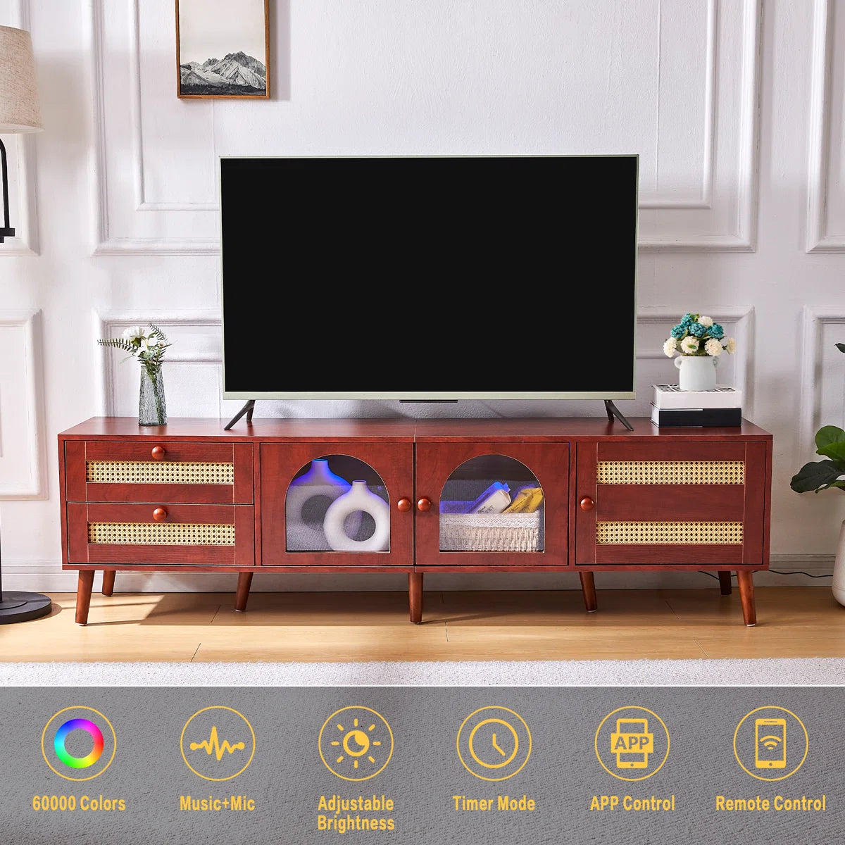 tv panel: 70" Rattan tv panels With 3 Cabinets & 2 Drawers,LED Light Entertainment Center For Tv Up To 80"