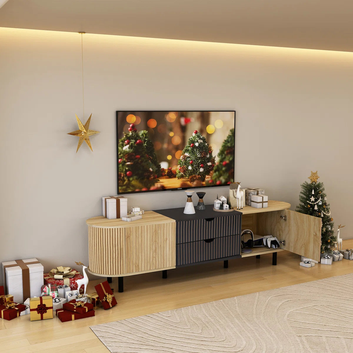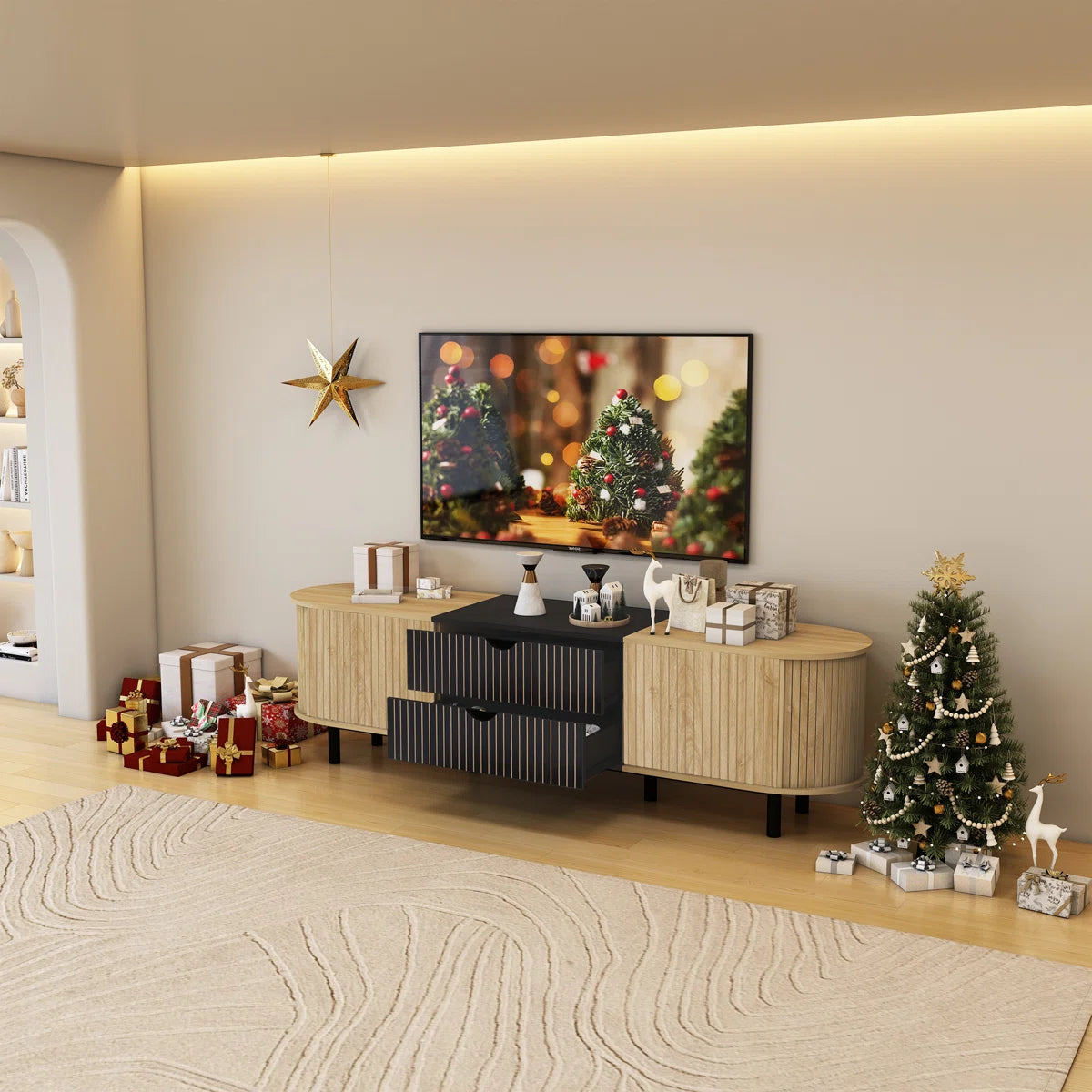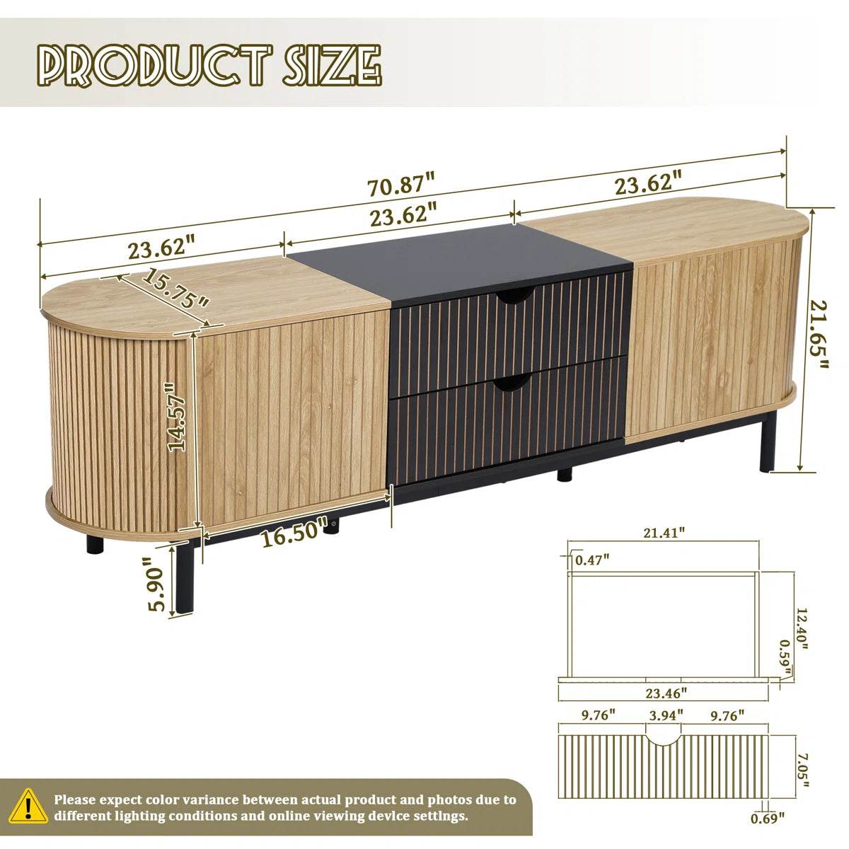 This 71" media console will add a touch of modern elegance and useful design to your living area. It adds a modern touch to your decor with its rounded corners, elegant colorblock finish, and fluted lines. Media devices and accessories can be conveniently stored in the roomy cabinets and two drawers. The cabinet's handleless push-to-pop design makes it simple to open the door with a single press. This TV stand, which is made of sturdy materials, provides both style and functionality for your entertainment needs.