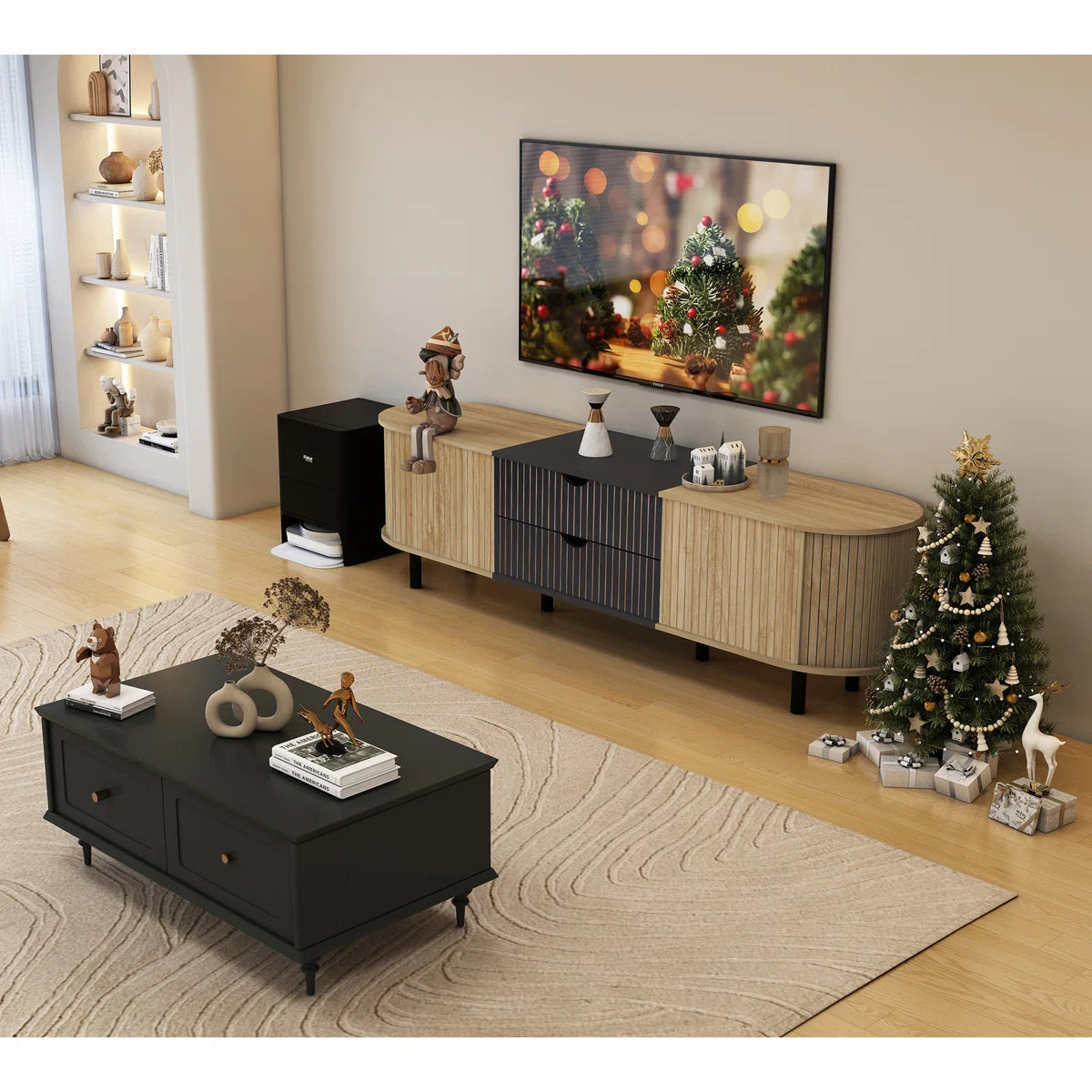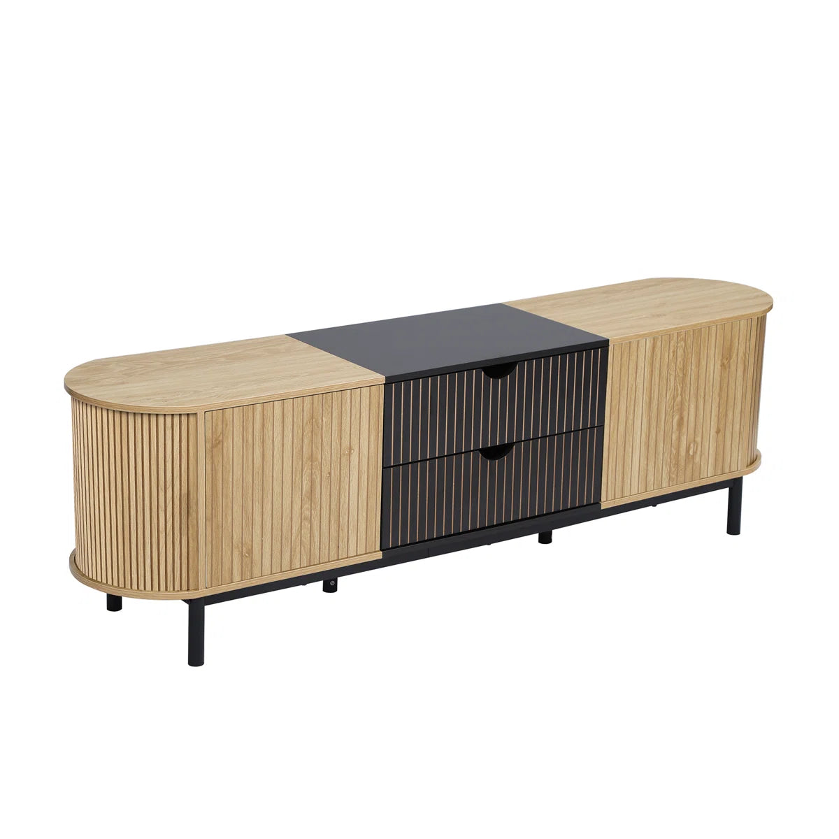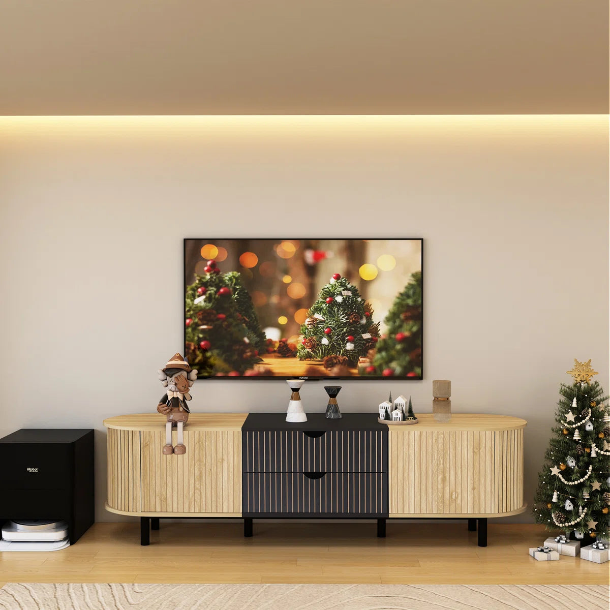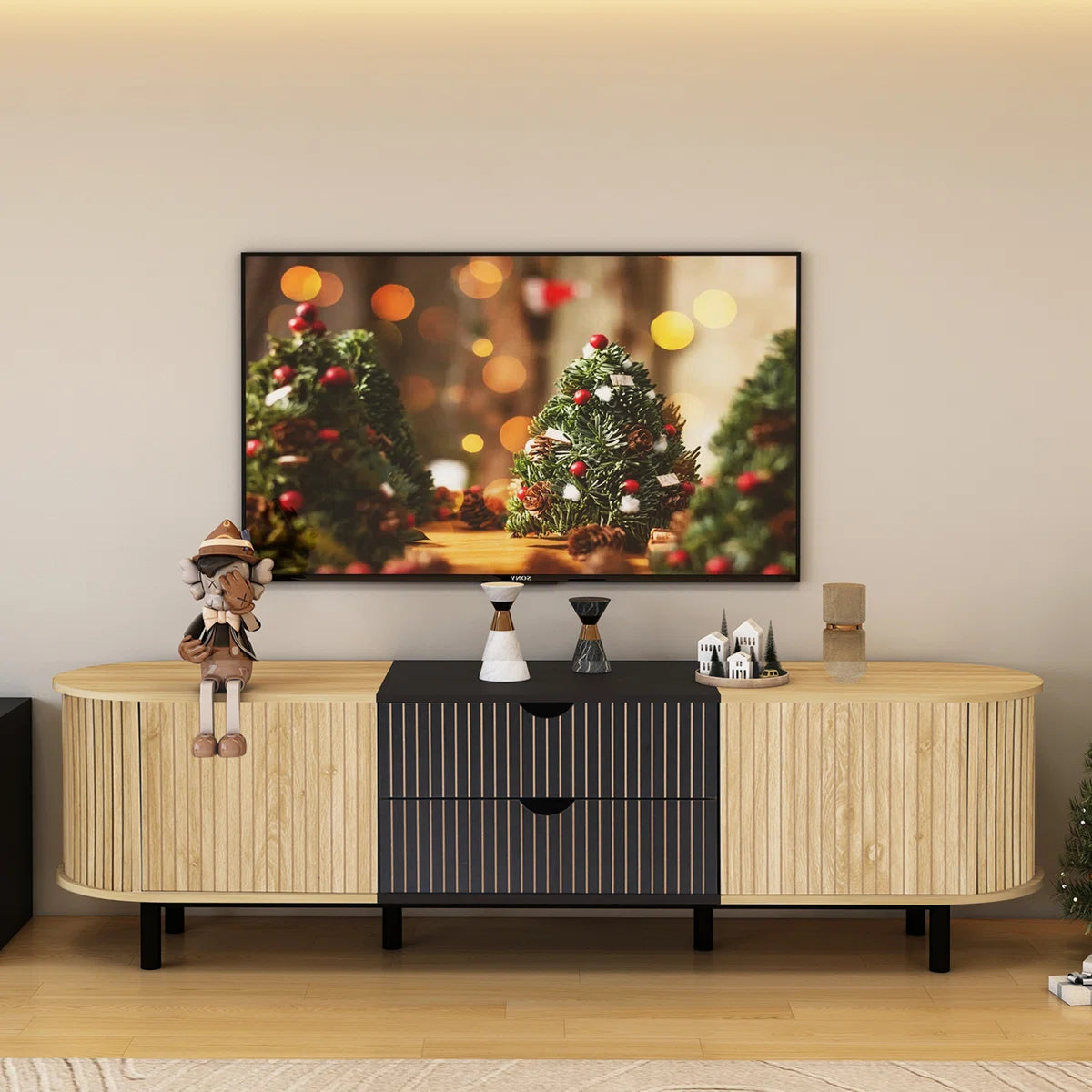 This 71" media console will add a touch of modern elegance and useful design to your living area. It adds a modern touch to your decor with its rounded corners, elegant colorblock finish, and fluted lines. Media devices and accessories can be conveniently stored in the roomy cabinets and two drawers. The cabinet's handleless push-to-pop design makes it simple to open the door with a single press. This TV stand, which is made of sturdy materials, provides both style and functionality for your entertainment needs.