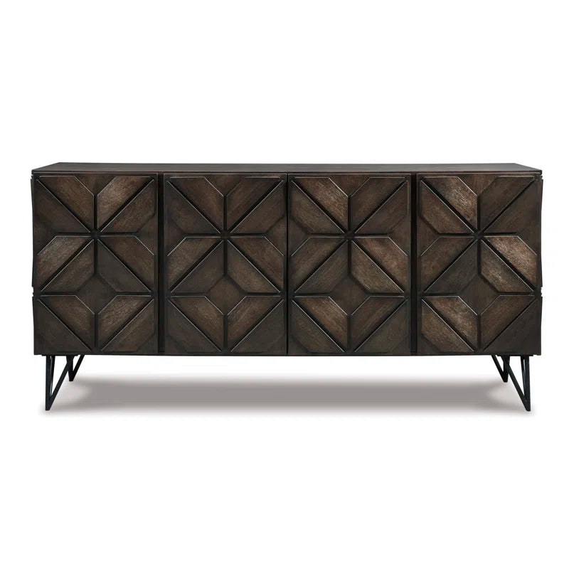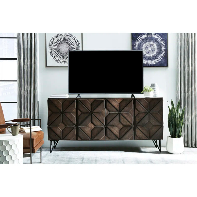 With this extra-large TV stand, you can explore the possibilities. This sleek, stylish cabinet stand, which accommodates, is a testament to the fact that furniture can be an art form. Its geometric overlay design makes it stand out from the crowd. It is quite accommodating with wire management cuts and movable storage. Additionally, this TV stand doubles as a console for the foyer or a server for the dining area. How does lasting power look?