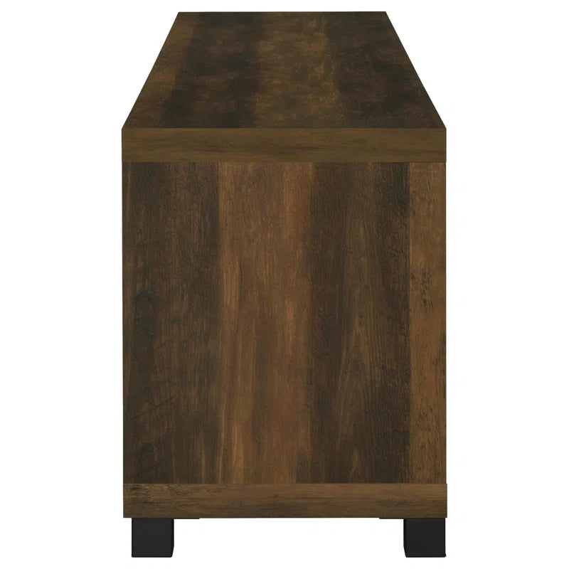 Our rustic urban TV stand is the ideal combination of classic style and contemporary practicality to elevate your living space. This piece, which has four spacious compartments that guarantee your media devices are well-organized and conveniently accessible, is accentuated by eye-catching black hardware accents. Style and functionality are added by contrasting fixed shelves with an elegant glass door. Combine this stand with our matching media towers for a unified appearance and more storage. The stand's boxy shape, smooth surfaces, and multipurpose adjustable shelves give it a modern feel that makes it more than simply a piece of furniture—it's a statement of superior design.