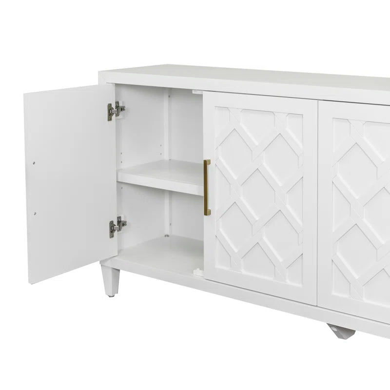 - The storage space, featuring two adjustable shelves, is concealed by four wooden doors