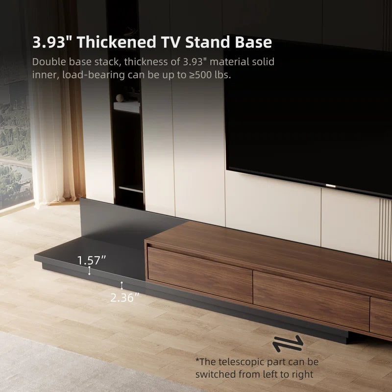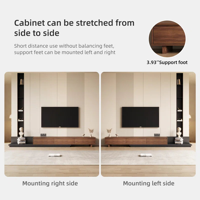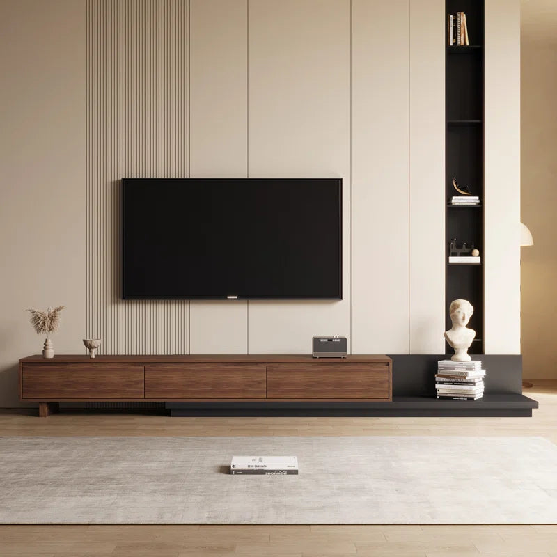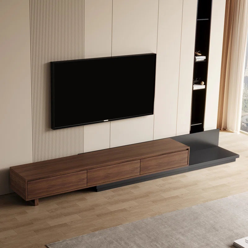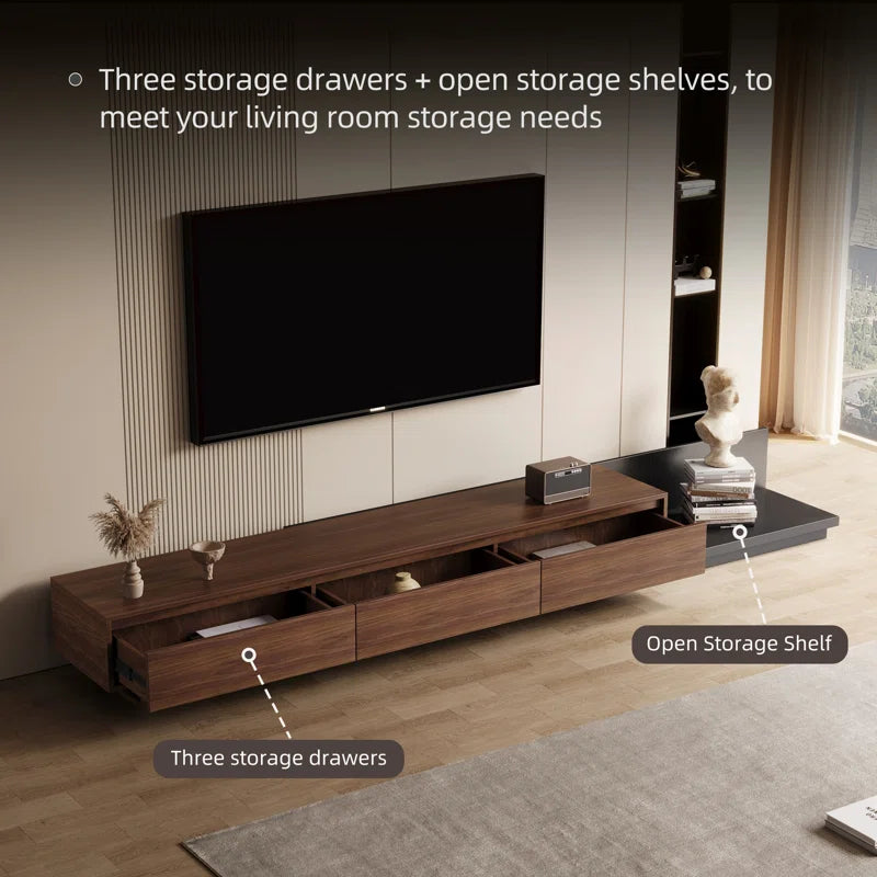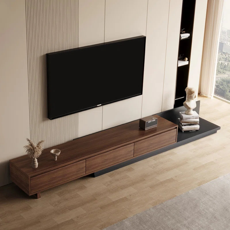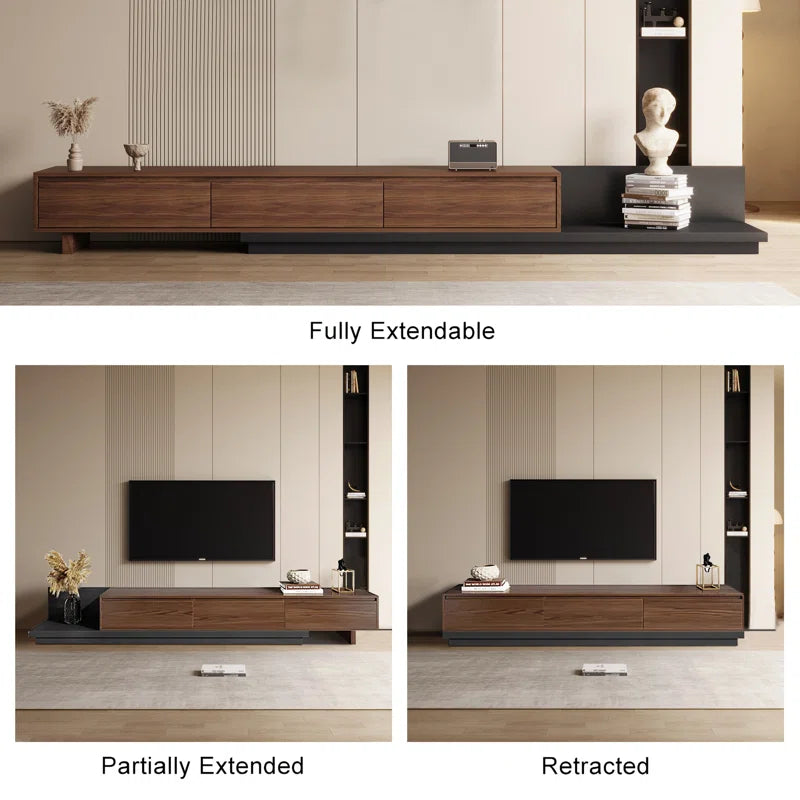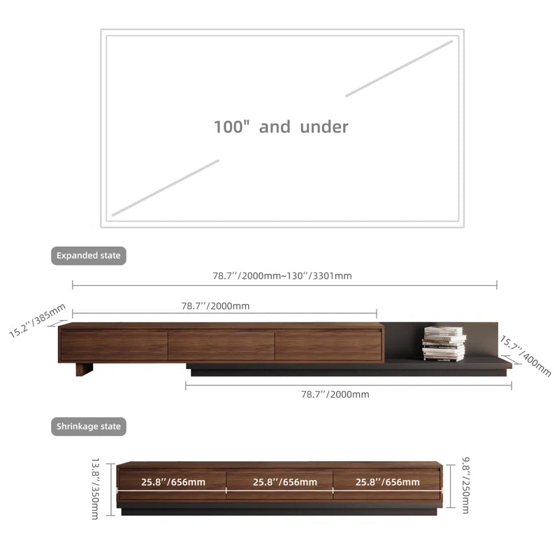 This TV stand will give your living area a timeless look. With its amazing retractable and extended walnut and gray design, this TV console complements any other interior design and may be used in the living room or video room. Its sliding, extended desktop serves as an additional nested cabinet for your Wi-Fi and sound equipment, and its three drawers provide plenty of room for storing periodicals, DVDs, CDs, remote controls, and other multi-media necessities. Material: Manufactured wood (Drawer) and MDF - Maximum TV Size: 78.7"-130" - Total Retracted Dimensions: 78.7"W x 15.7"D x 13.8"H (2000mmW x 400mmD x 350mmH) Overall Extendable Dimensions:(3000mmW x 400mmD x 350mmH) 130"W x 15.7"D x 13.8"H There are three drawers. Care and Cleaning: Use a damp cloth to clean, then a clean cloth to dry. A freestanding TV stand that can be used in both the living room and the bedroom.