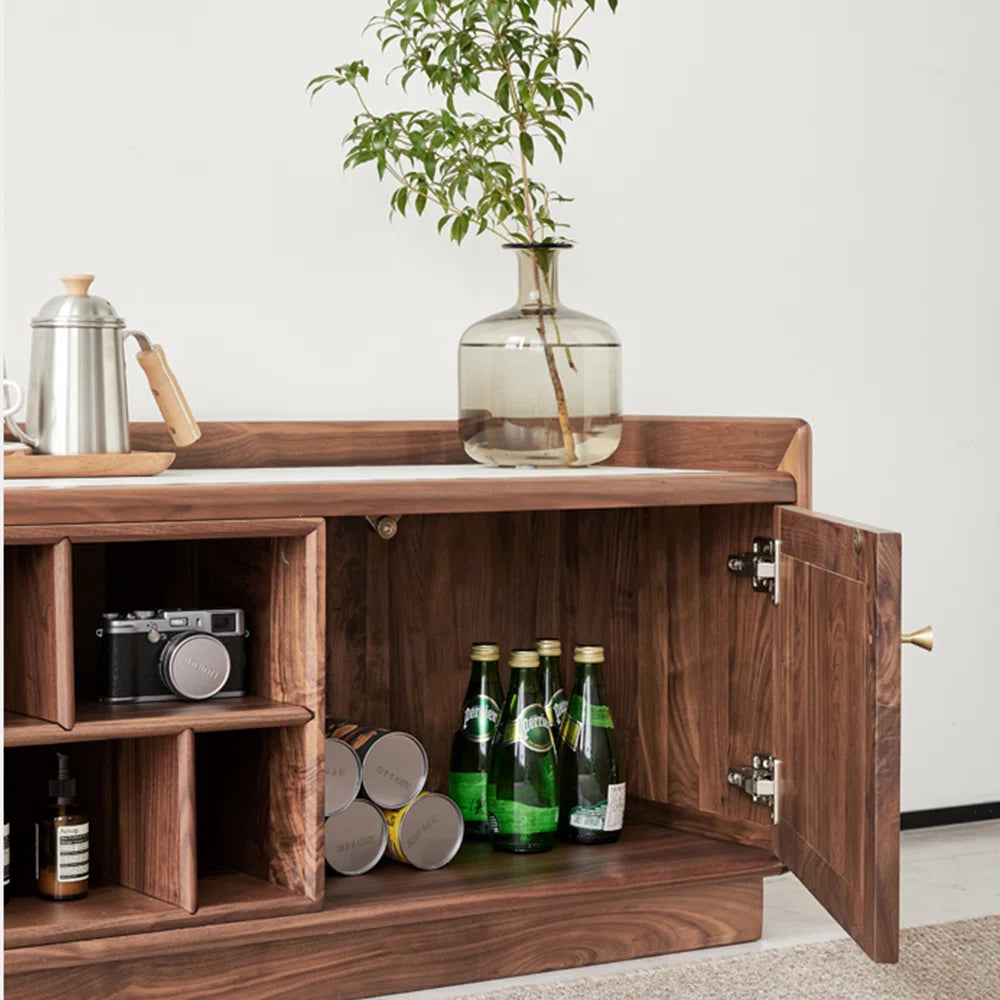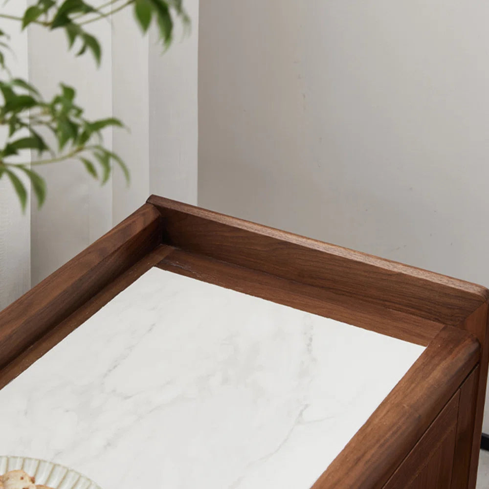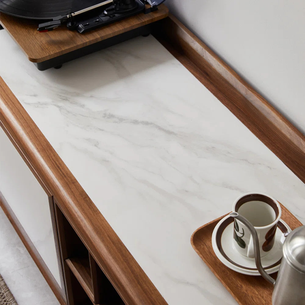 - Sintered stone is used to make the tv panel countertop because it is strong, long-lasting, and attractive. The tv panel is given a warm feel by the walnut frame, which accentuates a noble character with its natural wood grain. Walnut wood and sintered stone go well together and are both elegant and useful for a variety of house designs.