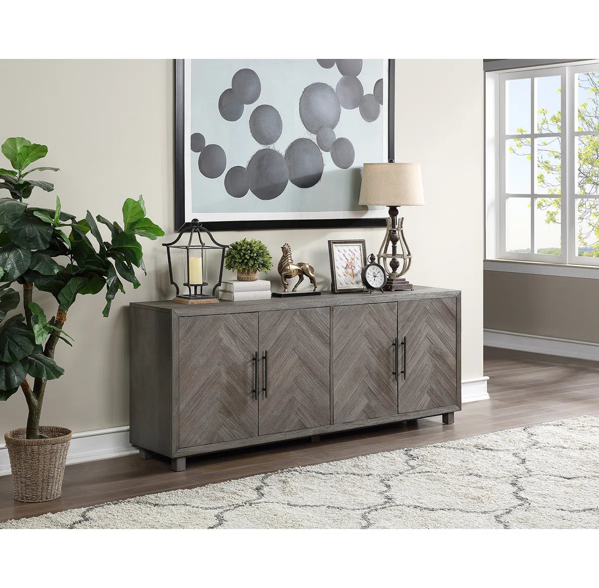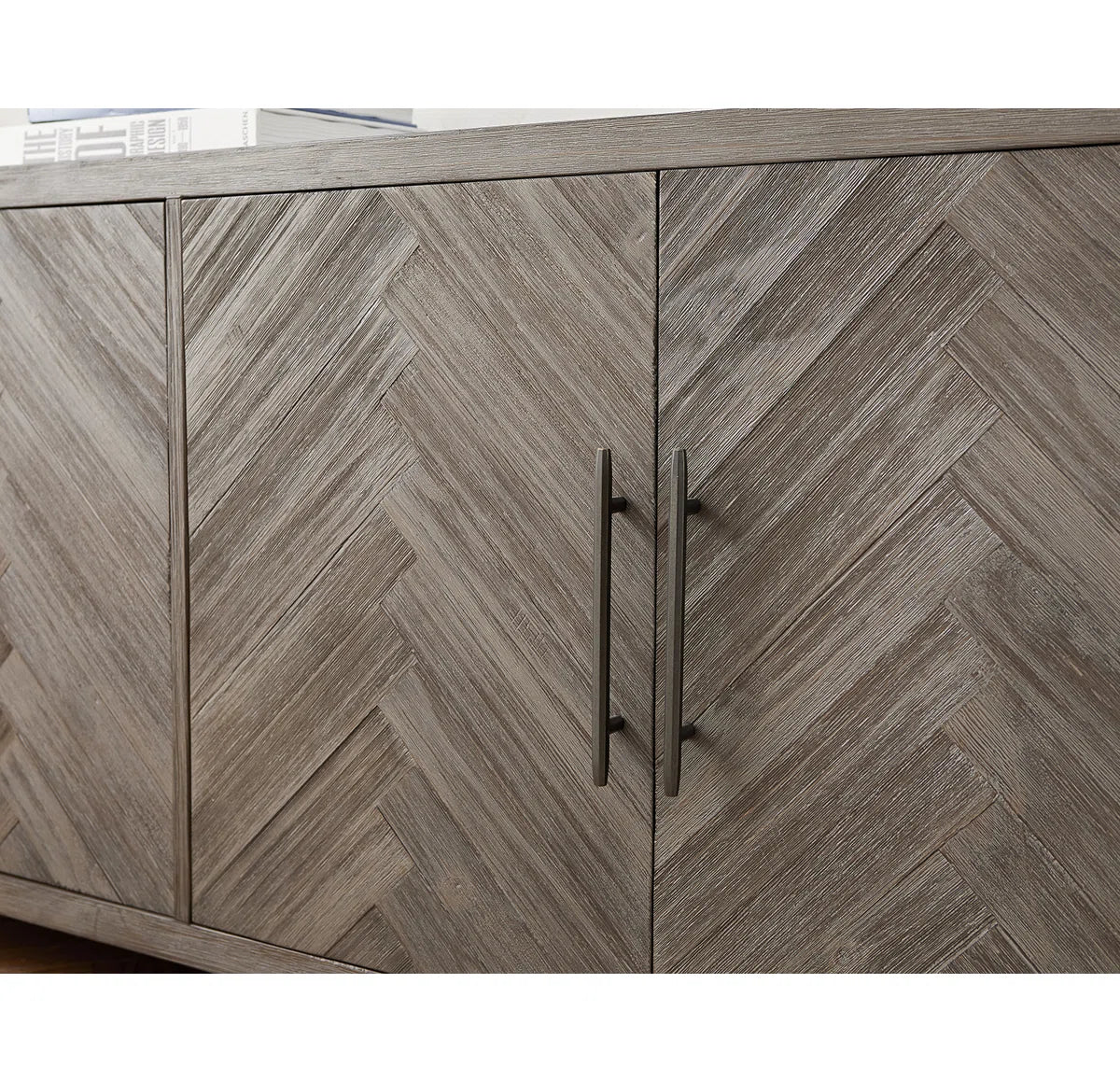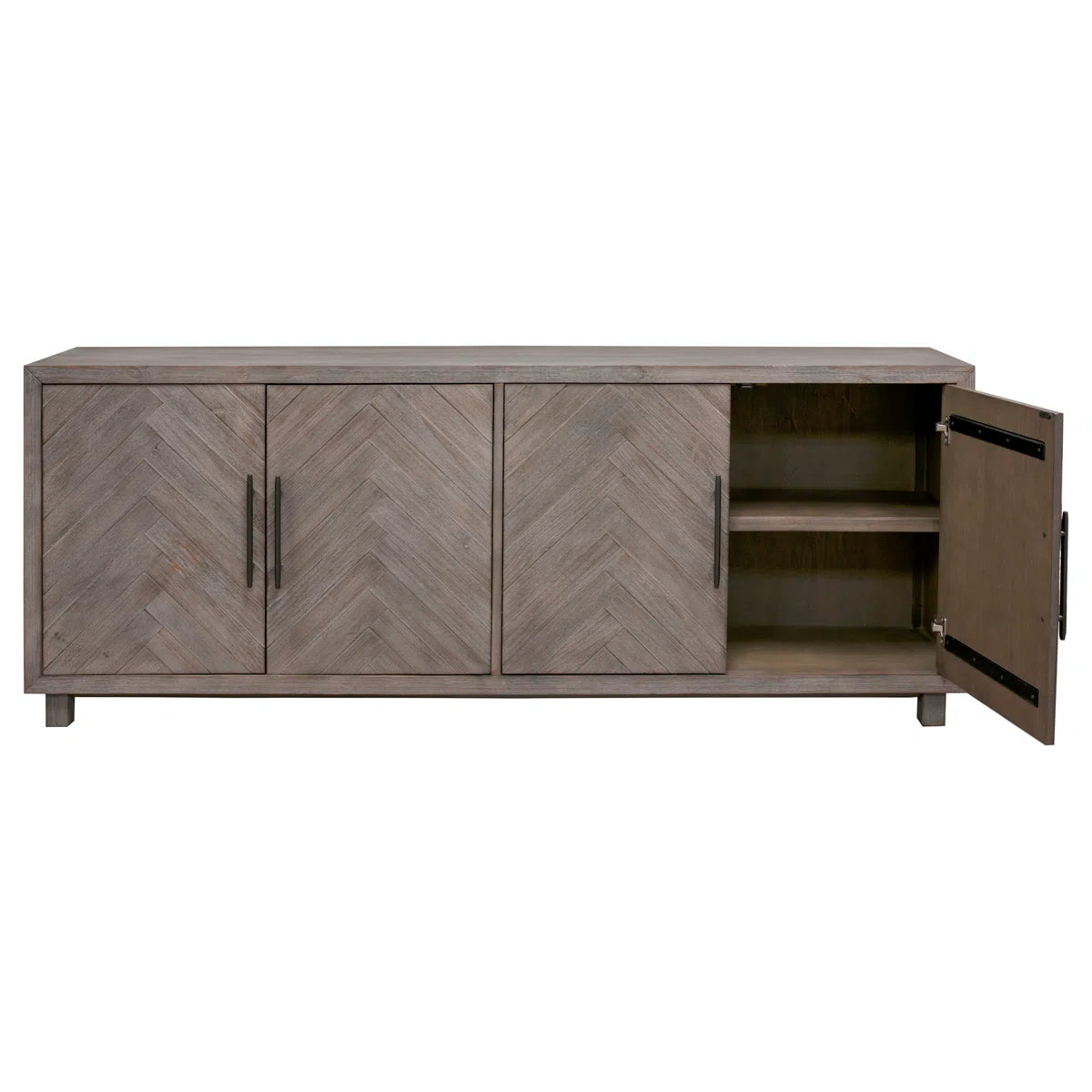 With its natural wood grain diversity, subtle distressing, and herringbone details, this TV stand adds a rustic touch to your living area. It is just the perfect size for an 85-inch TV and is made from a combination of solid and engineered wood. Shelves for board games, movies, and other media are visible when two sets of cabinets are opened. The shelves' ability to be adjusted to your needs is something we adore. Additionally, cord management is made simple via cutouts on the back panel.
