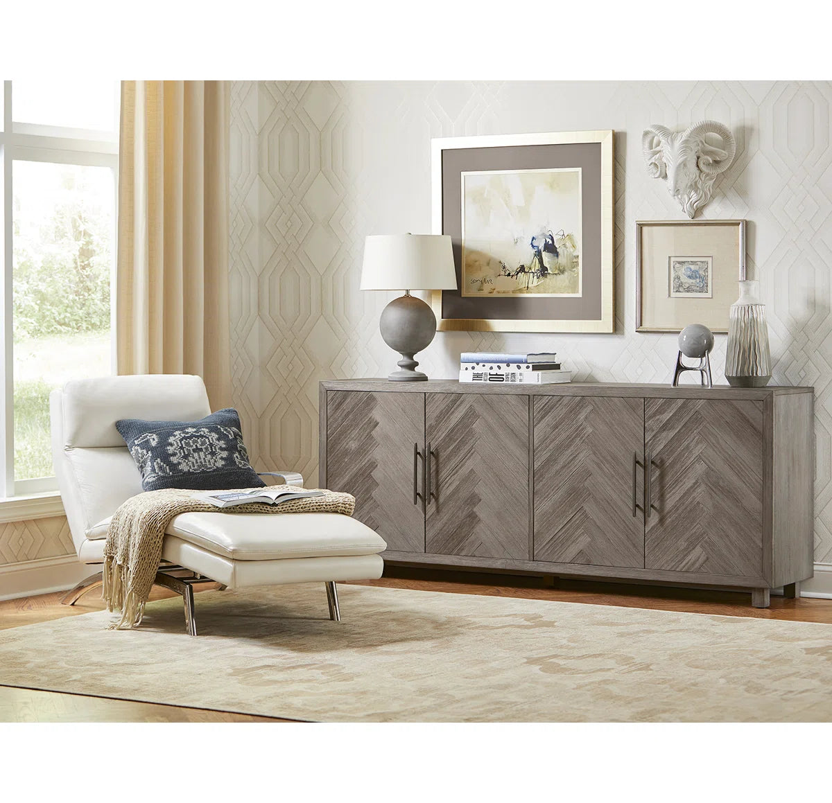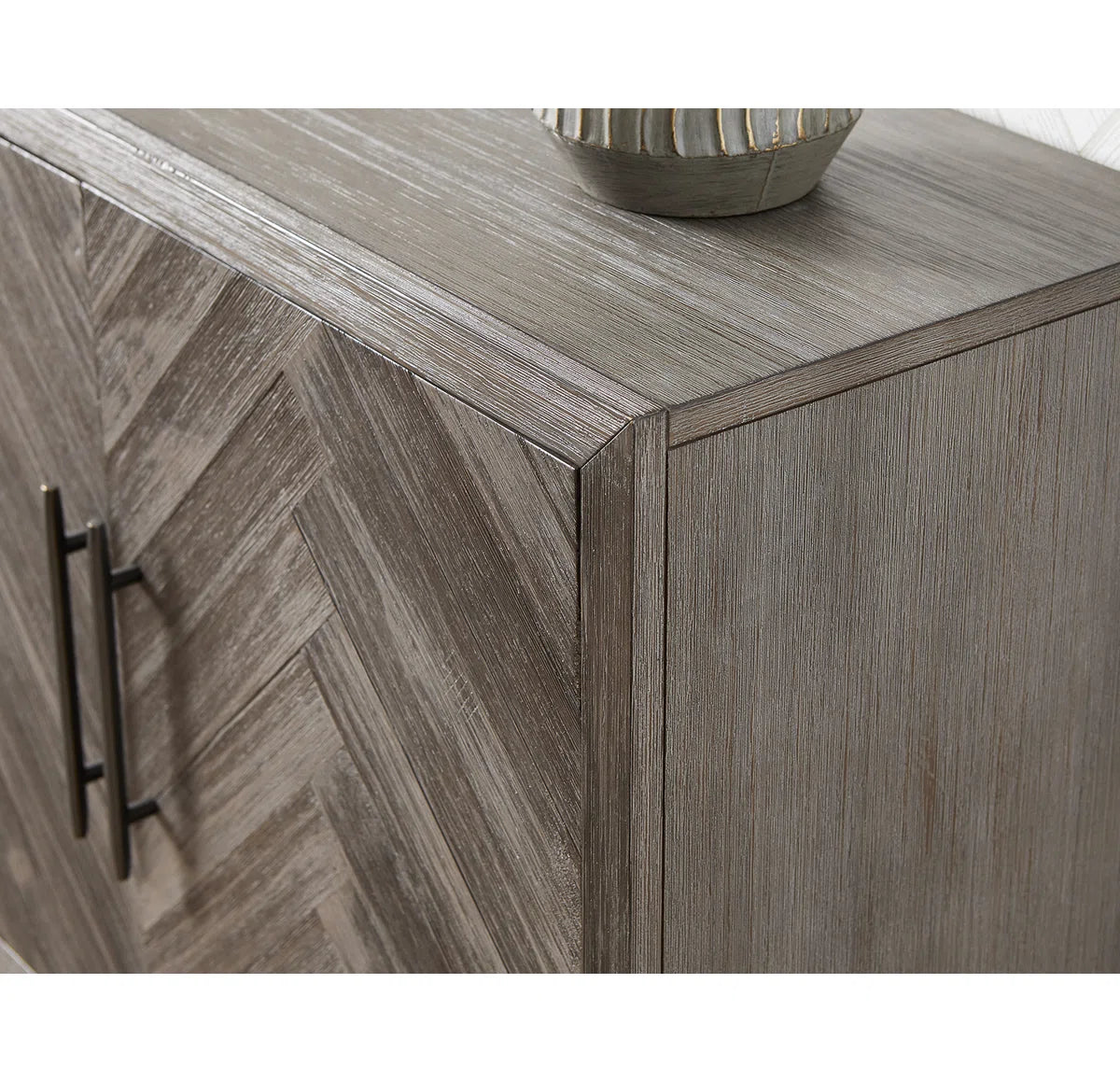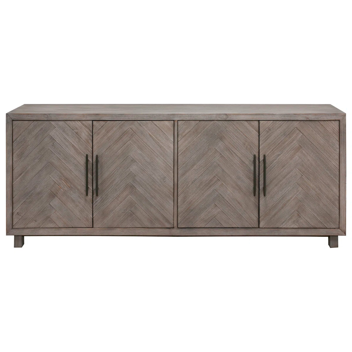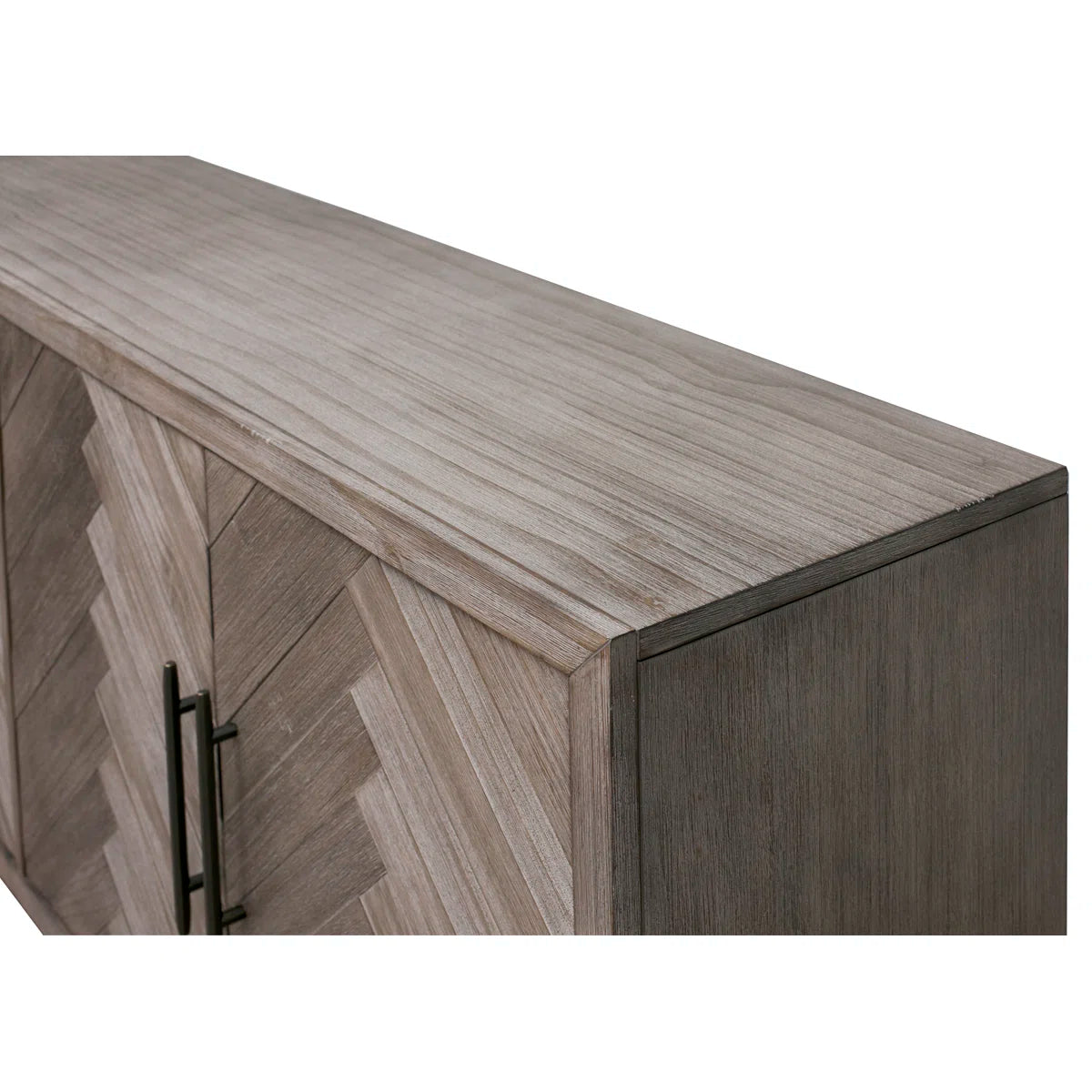 With its natural wood grain diversity, subtle distressing, and herringbone details, this TV stand adds a rustic touch to your living area. It is just the perfect size for an 85-inch TV and is made from a combination of solid and engineered wood. Shelves for board games, movies, and other media are visible when two sets of cabinets are opened. The shelves' ability to be adjusted to your needs is something we adore. Additionally, cord management is made simple via cutouts on the back panel.