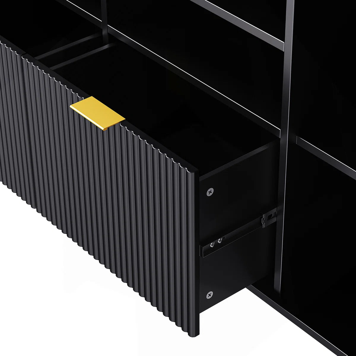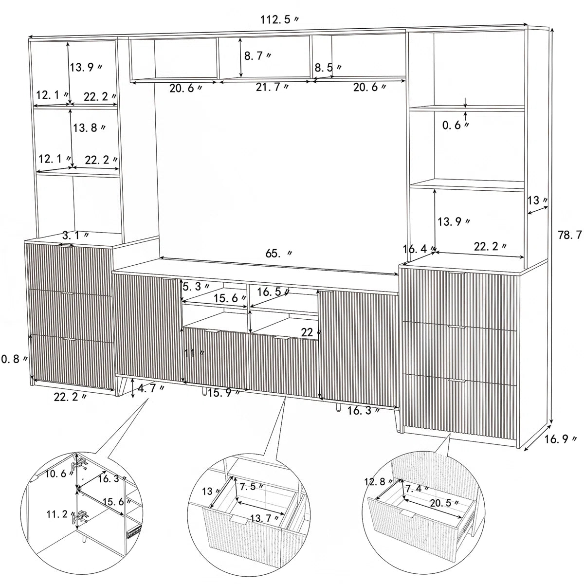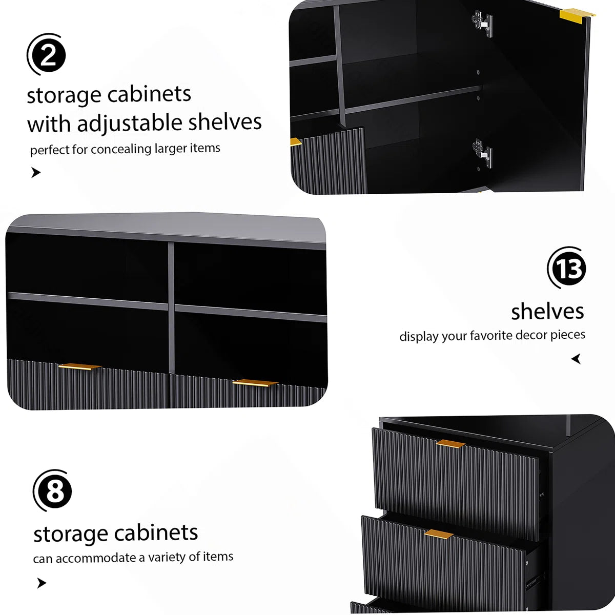 - Keeping your living room clutter-free and organized is made simple by the 13 shelves, 8 drawers, and 2 cabinets that provide enough storage space for all of your media devices, DVDs, and other necessities.