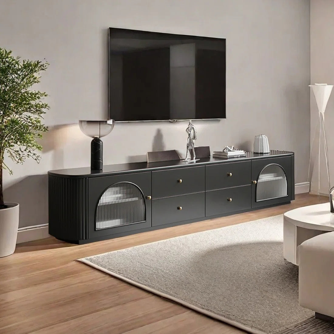 This tv panel has exceptional strength and moisture resistance since it is made of premium multilayer solid wood. The ribbed glass doors offer a fashionable yet practical appearance, keeping out dust and stains, and the big wood drawers allow for dust-free and well-organized storage. Pre-drilled cable holes encourage airflow and a neat setup, while the rounded edges guarantee safety.