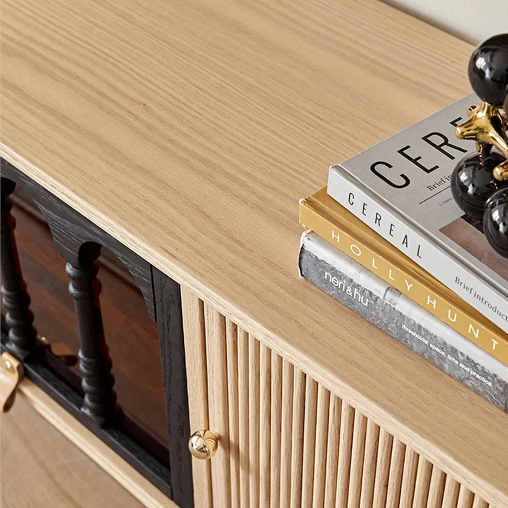 It has a creative design without drawers and 20% more storage capacity. Eliminating dividers makes more space. There are two types of operation for the concealed cabinet door design. The strong wood slide of a roller shutter is long-lasting. The tastefully selected copper and leather handles, along with tinted tempered glass, comprise the attractive arch shape. Beauty and stability are added by the spherically decorated, soft, cylindrical legs.