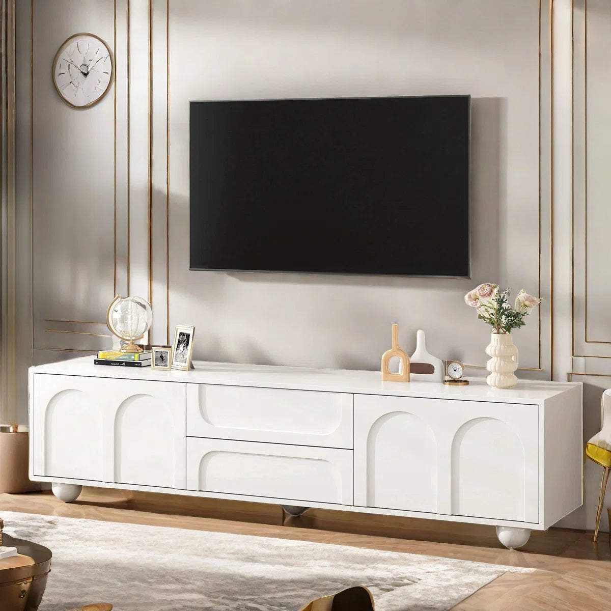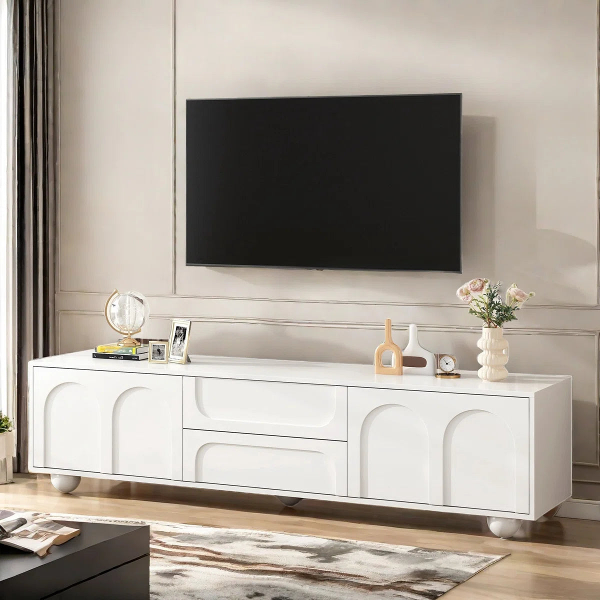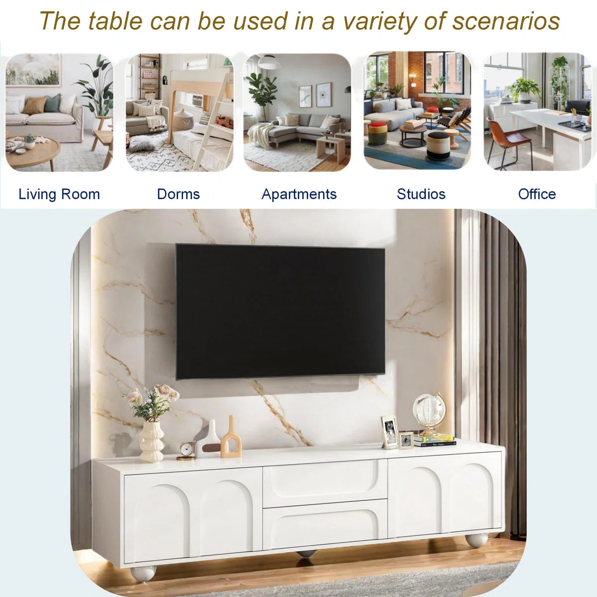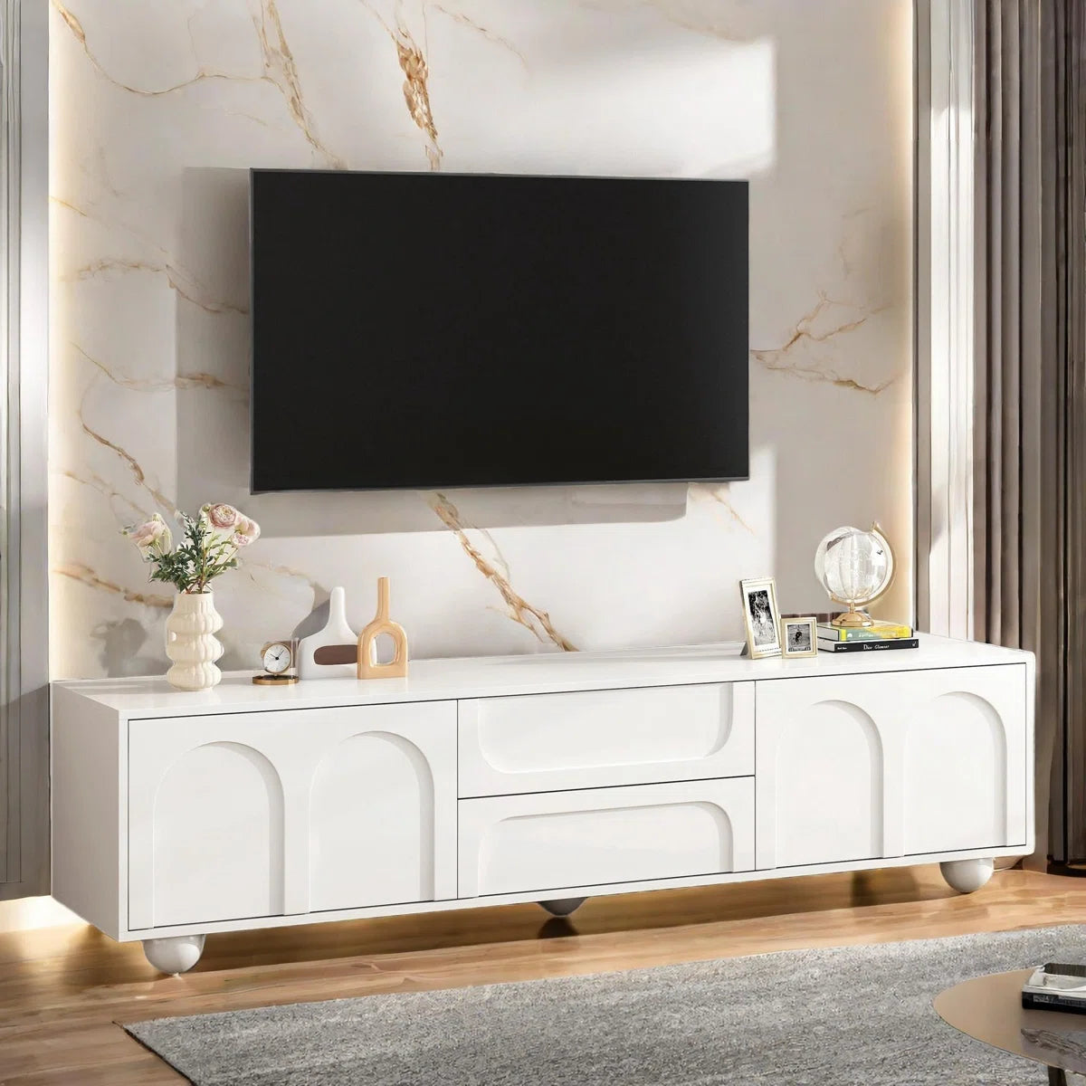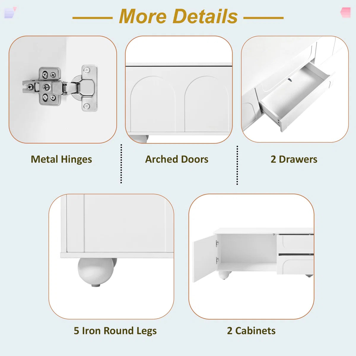 This tv panel has a distinctive arched panel. A cozy and welcoming family area is added by the arch design, which also softens the overall shape and successfully lessens the visual impact of sharp corners. With its basic yet attractive design, this tv panel can be effortlessly incorporated into a wide range of home designs, whether it is used in the living room or the bedroom. The five spherical legs are both aesthetically pleasing and provide outstanding stability and load-bearing capability. The legs can efficiently support the entire frame and are composed of sturdy painted iron. Furthermore, the tv panel has two drawers and two storage cabinets, giving customers plenty of room to store magazines, remote controls, and other small items to maintain a tidy house. In order to improve the opening and closing experience, this tv panel also has a rebound mechanism in addition to hinged doors made of stainless steel. The drawer eliminates the issue of typical drawer jams in conventional furniture and features a metal sliding mechanism for exceptional durability and simplicity of opening and shutting. This tv panel can accommodate any demand, be it for TV, AV equipment, or daily objects. The TV frame's primary material is particleboard, which not only resists wear well but also efficiently repels moisture and prolongs its useful life. Furthermore, because of its distinctive form and adaptability, it may be used as a bookshelf, display shelf, and more, significantly expanding its range of applications beyond TV use.