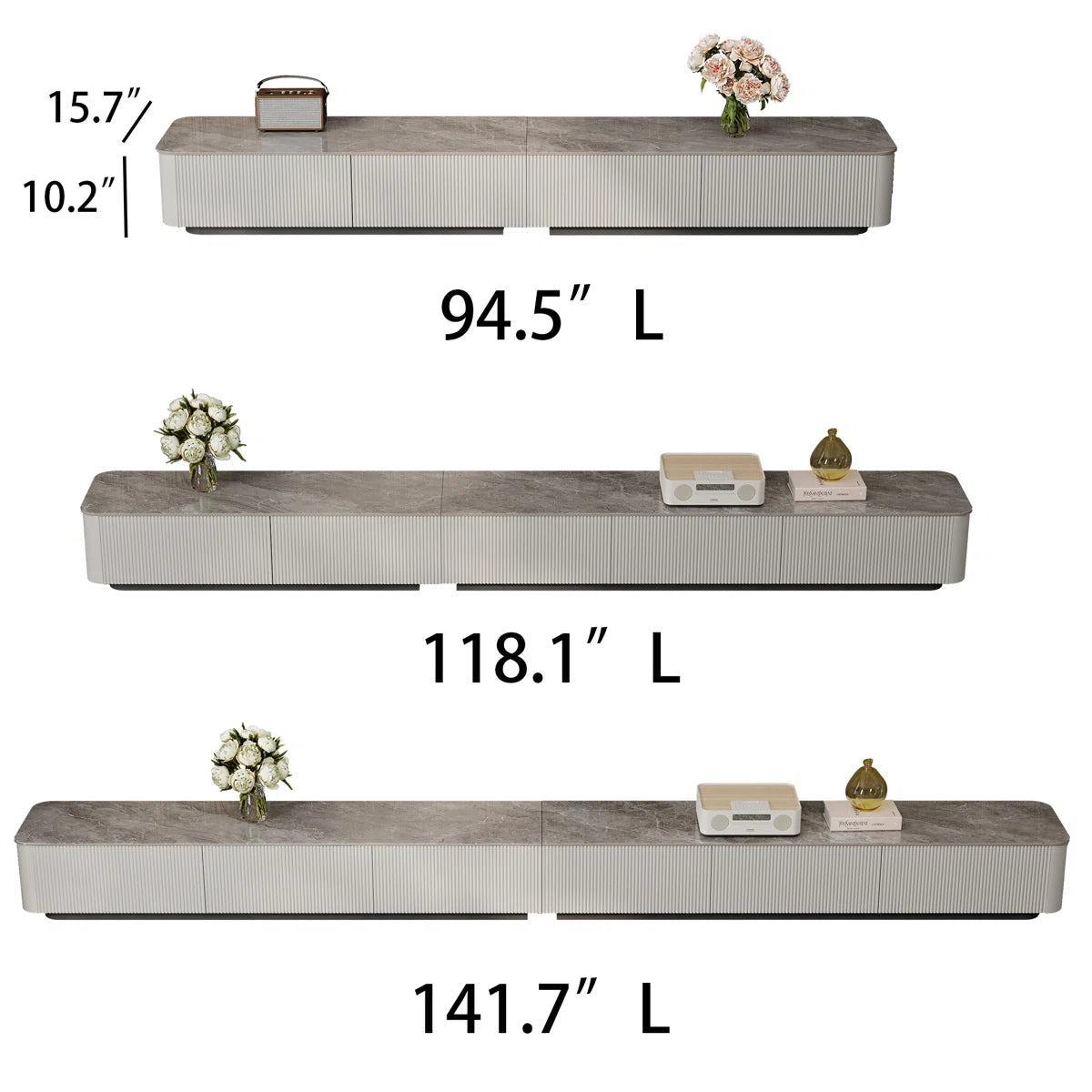 Owning our elegant vertical stripe TV stand, a true masterpiece that blends elegance and functionality, will allow you to fully immerse yourself in modern sophistication. This cabinet, which represents the pinnacle of personalized luxury, is available in three sizes: 94.5", 118", and 141".