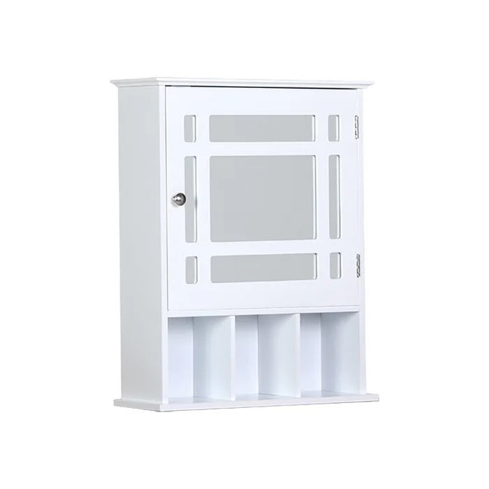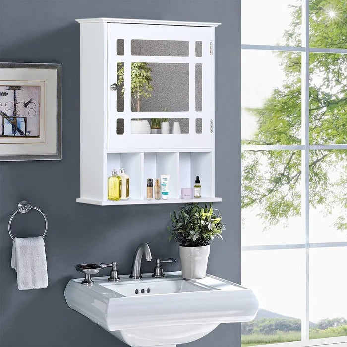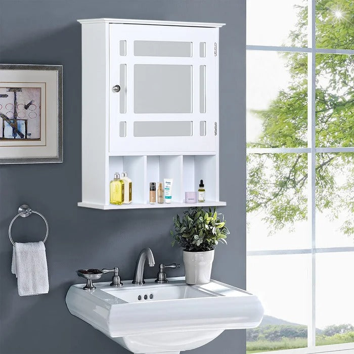 Store your personal items out of sight with this mirrored wall cabinet. A sturdy wooden cabinet construction supports a large glass mirror and wood trim in this spacious medicine cabinet. The crisp white finish and flared molding bring a sleek and modern look to your updated powder room.